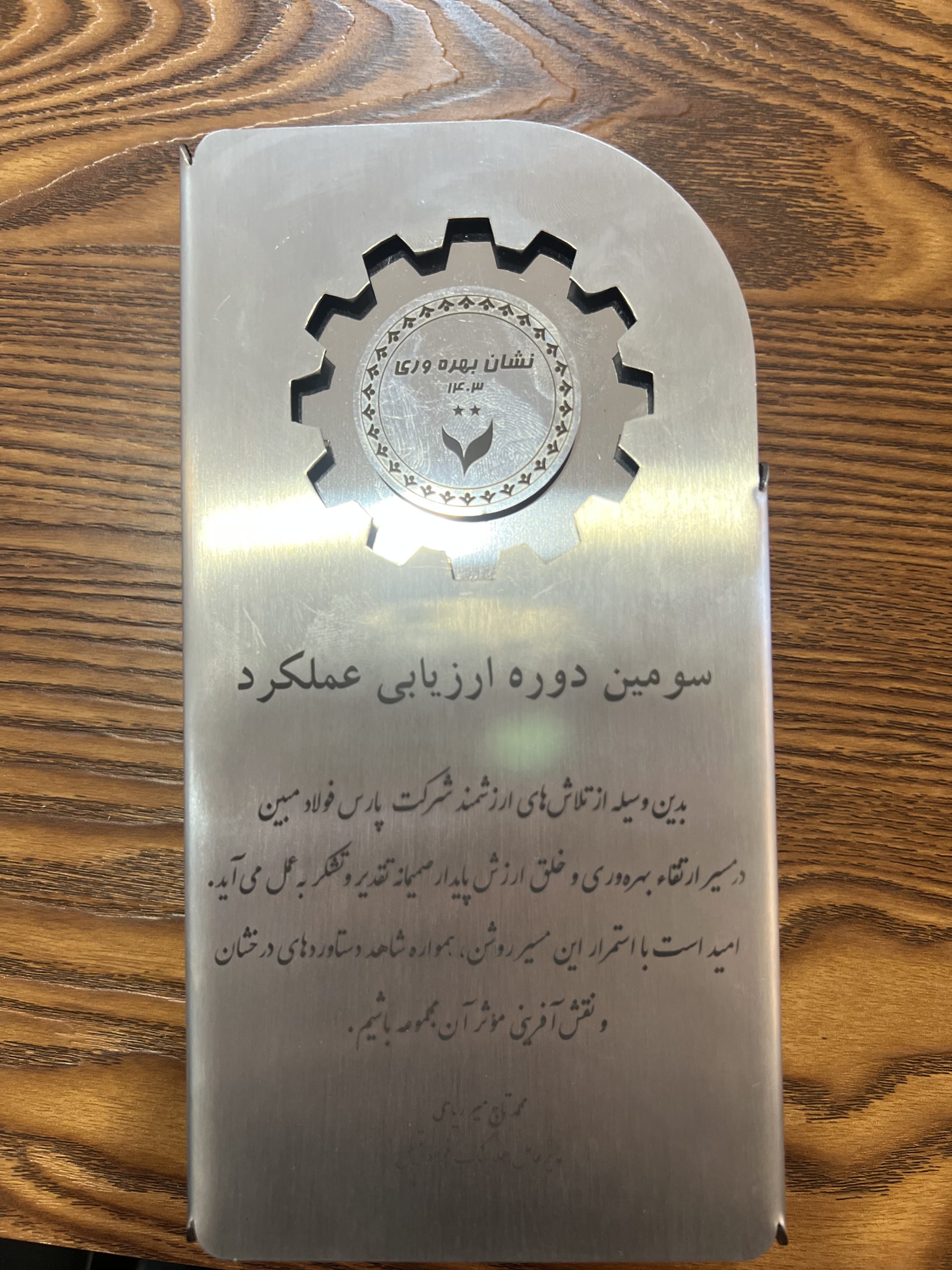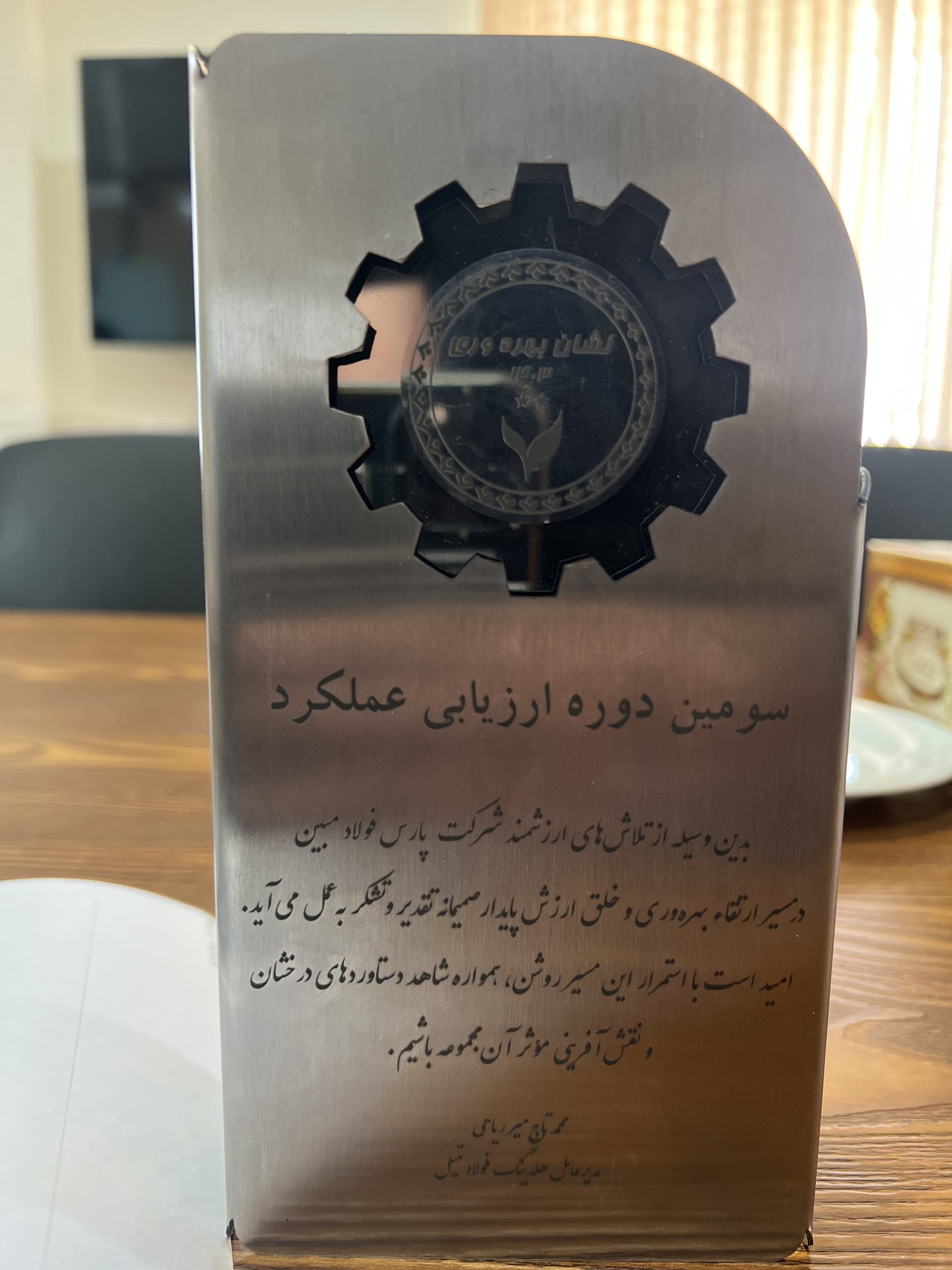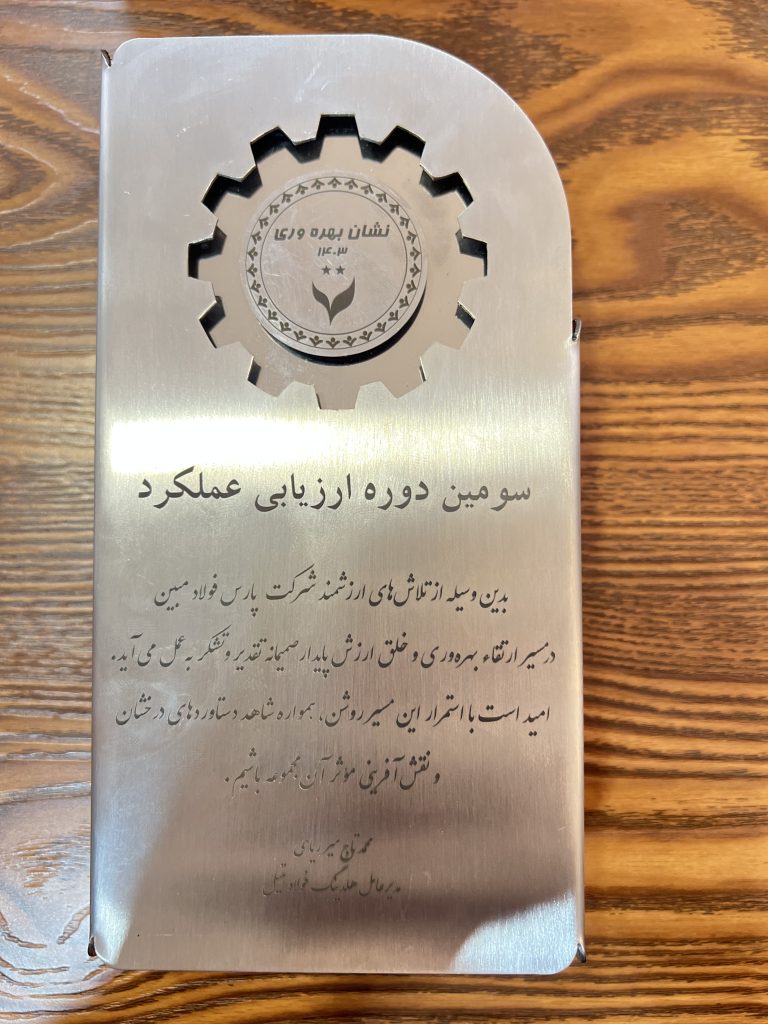 در این مراسم، لوح سپاس و نشان بهرهوری و خلق ارزش پایدار توسط جناب آقای محمد تاجمیر ریاحی، مدیرعامل محترم هلدینگ فولاد متیل، به مهندس رضا درباری مدیرعامل محترم شرکت پارس فولاد مبین اهدا شد.